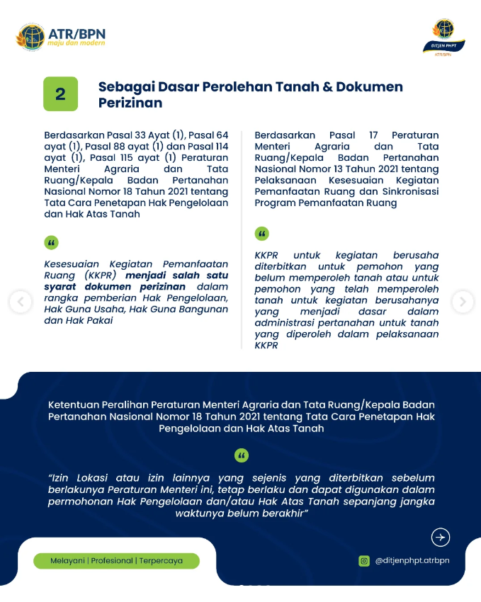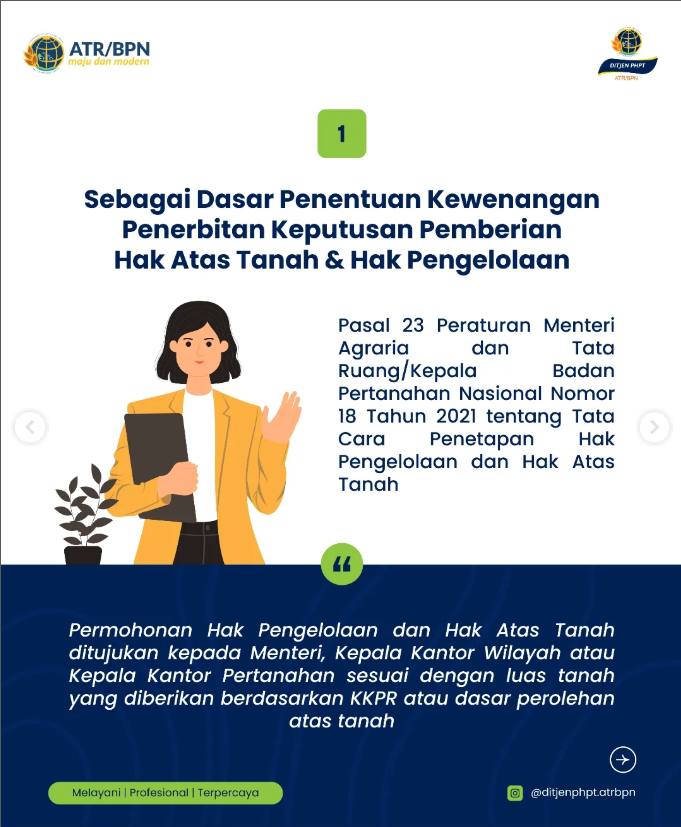 Hai Sob, dengan diterbitkannya Peraturan Menteri ATR/Kepala BPN Nomor 18 Tahun 2021 dan Peraturan Menteri ATR/KBPN Nomor 21 Tahun 2021, Kesesuaian Kegiatan Pemanfaatan Ruang yang selanjutnya disingkat KKPR menjadi dokumen yang memiliki peran dan fungsi dalam rangka kegiatan penetapan hak pengelolaan dan hak atas tanah lho Sob, antara lain: