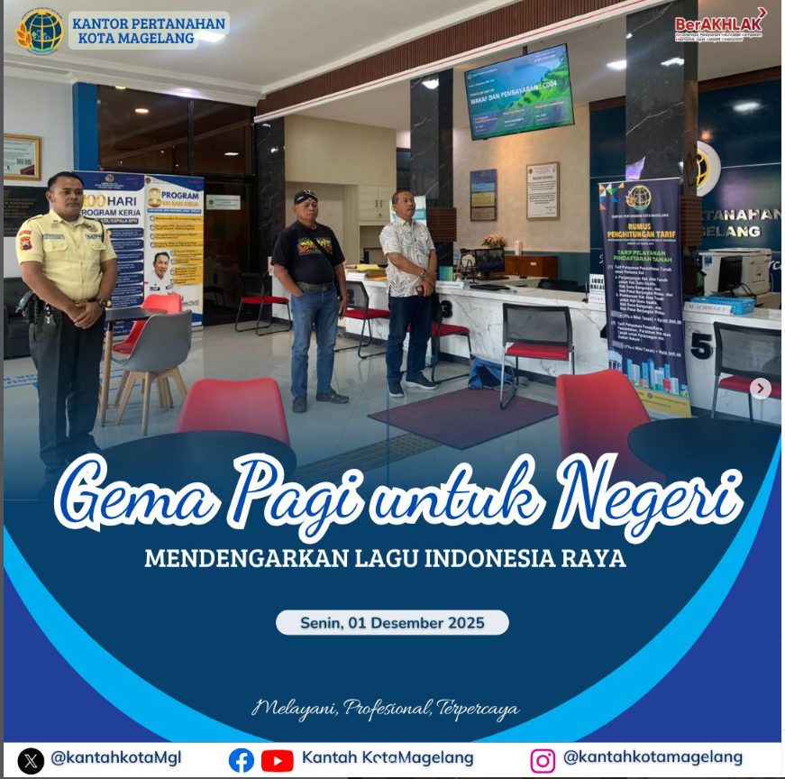 Pada hari Senin 1 Desember 2025, di Kantor Pertanahan Kota Magelang, seluruh pegawai dan pemohon melaksanakan kegiatan mendengarkan Lagu Indonesia Raya pada pukul 10.00 WIB sebagai wujud kecintaan dan penghormatan terhadap Tanah Air.